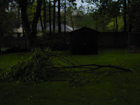 We were watching Babe on the T.V. and Mr.Fixit said, "Holy smokes! Look out the window!" There was rain and wind all over the place! Our tree that is 41 years old may have to be cut down! Because two branches fell on the ground and both look the size of a 10 year tree!
