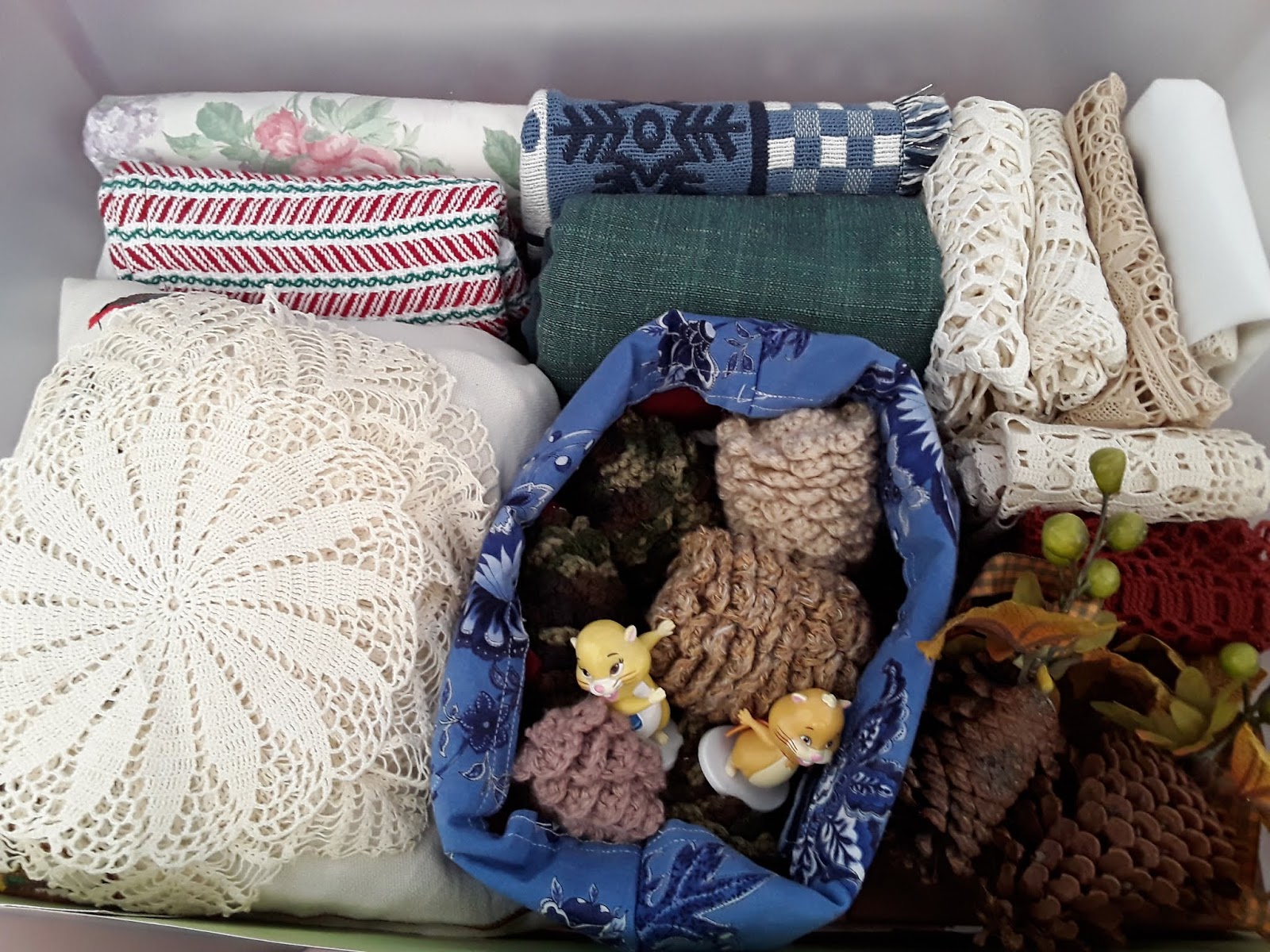 One drawer is for doilies, mats, and small tablecloths, because I've never been able to arrange them "joyfully" before, or get at them easily, and because we got rid of their bin. Also some crocheted pinecones which never had a real home before.