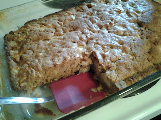The cake recipe sounds like it shouldn't work, or taste good, but it does (both). It has no salt in it; it contains baking soda, but nothing acid like yogurt or sour milk for the soda to act on, so I'm not sure (kitchen-chemistry-wise) why the soda instead of baking powder, but it did rise. I don't have the Bundt pan that the book called for, so I used our 10 x 15 inch glass pan.